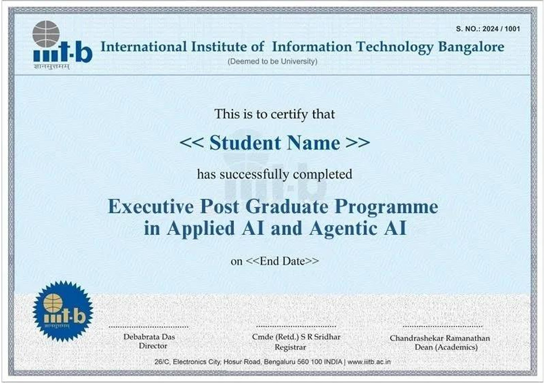 - Earn an Applied AI & Agentic AI certificate from the globally recognized IIIT-B along with its executive alumni status.